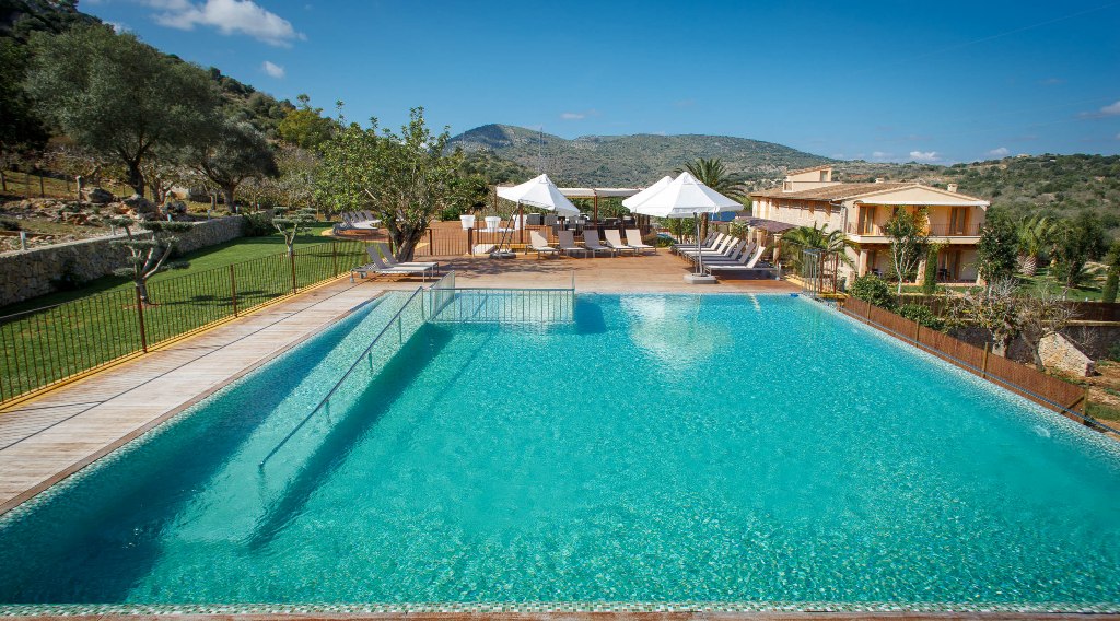 A combination of modern comfort and child-friendliness: Noble upholstered poufries, as one only finds them in luxurious finca hotels, next to the children's pool and the chillout set next to the children's playground. While the parents are still sitting at the candle-light dinner, the little ones sleep in their own beds and the larger children feed the sheep.